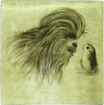 Chewbacca is curious about a cute little porg on this artistic Star Wars magnet! The Star Wars Force Awakens Chewbacca and Porg Magnet is a brown refrigerator magnet. Inspired by the movie Star Wars: The Force Awakens, it features a sketch drawing of Chewbacca encountering a porg, the curious, cliff-dwelling bird species from Ahch-To. "Luke called them porgs. They're adorable."