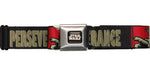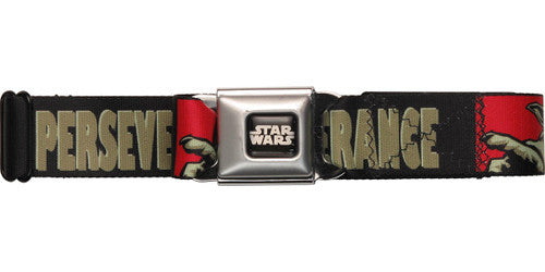 Stick to your guns the Jedi way with this cool Star Wars belt! The Star Wars Yoda Perseverance Seatbelt Mesh Belt is black. It has a 1.5 inch-wide belt with a metal seatbelt-style buckle, adjustable from 24-inch to 42-inch waist sizes. The silver buckle features the Star Wars movie title logo in white on black. The belt shows Yoda pointing on a red background, with the word "Perseverance" in green letters!