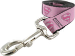 Fly the banner of the Girl of Steel with this fun, feminine Supergirl pet leash! The Supergirl Logos Pet Leash is a pink, four-foot nylon strap with a hand loop and a metal swivel spring hook clip. Inspired by DC Comics' Supergirl series, it features repeated images of the "S" shield logo worn by Supergirl in a dark pink outline format!