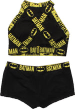 The design on this Batman swimsuit may remind you of yellow crime-scene tape, which would be appropriate for a Dark Knight theme! The Batman High Neck Mesh Bikini Swimsuit is black with a mesh overlay. The top is lined, with light removable padding, a closure at the back, and cross-back shoulder straps. This high-neck bikini features the word "Batman" in yellow and the famous oval bat-logo on the top and bottom, back and front, from DC Comics' Batman series. "I'm Batman!"