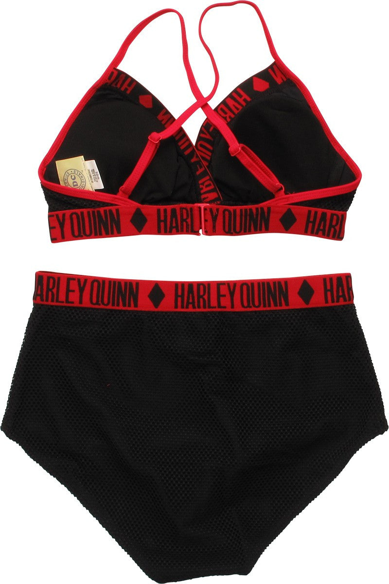 Take a dip in the psychotically fun side of the pool wearing this cool Harley Quinn swimsuit! The Harley Quinn Cross High Waist Bikini Swimsuit is black with a mesh overlay. The top is lined, with light removable padding, a closure at the back and adjustable cross straps. The bottom is lined, with a high waist. Inspired by DC Comics' Batman series, this bikini features the name "Harley Quinn" in black and a diamond on red lining top, bottom, front and back. "Miss me puddin'?"