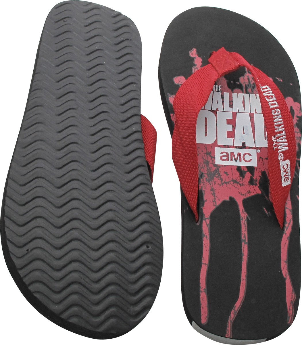 This pair of Walking Dead ladies sandals features the bloody red smears often seen on the gruesome TV series! The Walking Dead Logo Blood Splatter Ladies Sandals are black with red mesh uppers. They feature trailing "blood stains" below the title logo for TV's The Walking Dead in white letters. Survive!