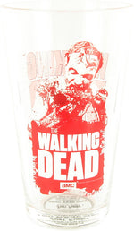 A ravenous zombie chows down on a bloody meal on this gruesome Walking Dead glass! The Walking Dead Red Zombie Pint Glass is a clear pint glass, 5.75 inches tall. It features the title logo for TV's The Walking Dead in red letters on one side, while the other side features the logo in white letters below the zombie, who is not using his napkin!