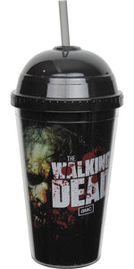 A groaning walker decorates one side of this gruesome, blood-spattered Walking Dead travel cup! The Walking Dead Zombie Dome Travel Cup is a black, BPA-free plastic travel cup with lid and straw that holds 16 ounces. It features the title logo for TV's The Walking Dead on two sides, one in blood-red letters, the other in white letters with blood drops, with the walker in the background. Fight the dead!