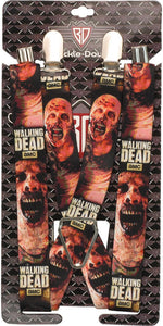 Let some scary walkers liven up your wardrobe when you wear this creepy but eye-catching pair of Walking Dead suspenders! The Walking Dead Zombie Face Suspenders are 1-inch wide with adjustable elastic straps and metal clips. The suspenders are black and feature the title logo for TV's grim horror drama The Walking Dead and images of ravenous walkers ready to bite into flesh!