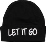 Find your own meaning in the famous song title featured on this cool Frozen beanie! The Frozen Let It Go Cuff Beanie is black. The turned-up cuff is embroidered with the name of the song "Let It Go" in white letters, sung by Elsa the Snow Queen in the Disney movie Frozen!