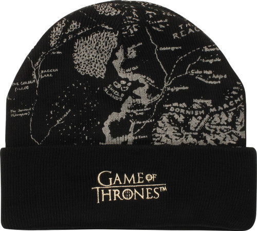 Show you know your way around Westeros when you wear this fun Game of Thrones beanie! The Game of Thrones Lannister Map Cuff Beanie is black. The turned-up cuff features the title logo for TV's Game of Thrones in white letters on one side and the name "Lannister" on the other side, while the beanie is covered front and back with a map of Westeros. "Hear Me Roar!"